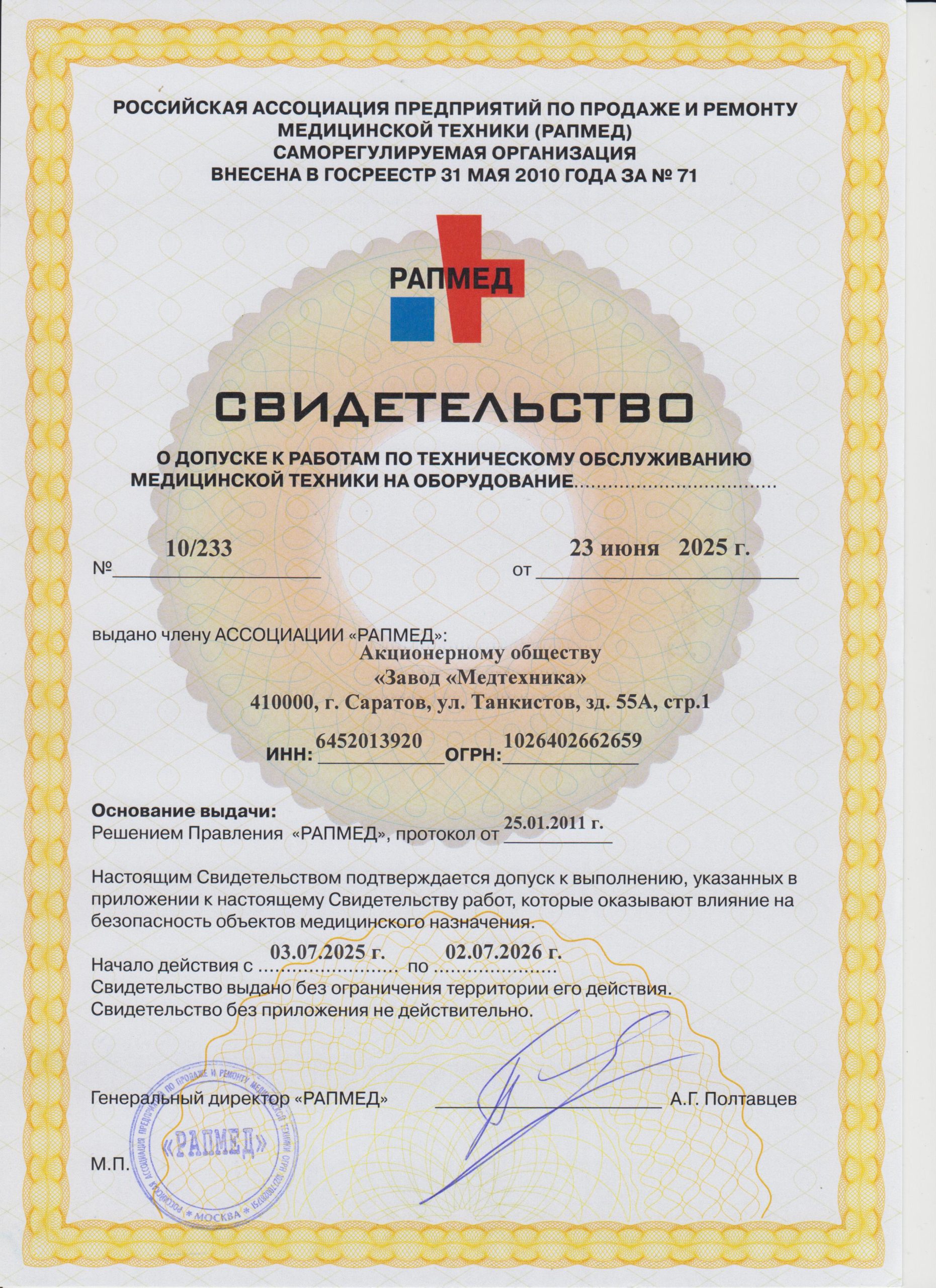 Свидетельство о допуске к работам по техническому обслуживанию медицинской техники на оборудование