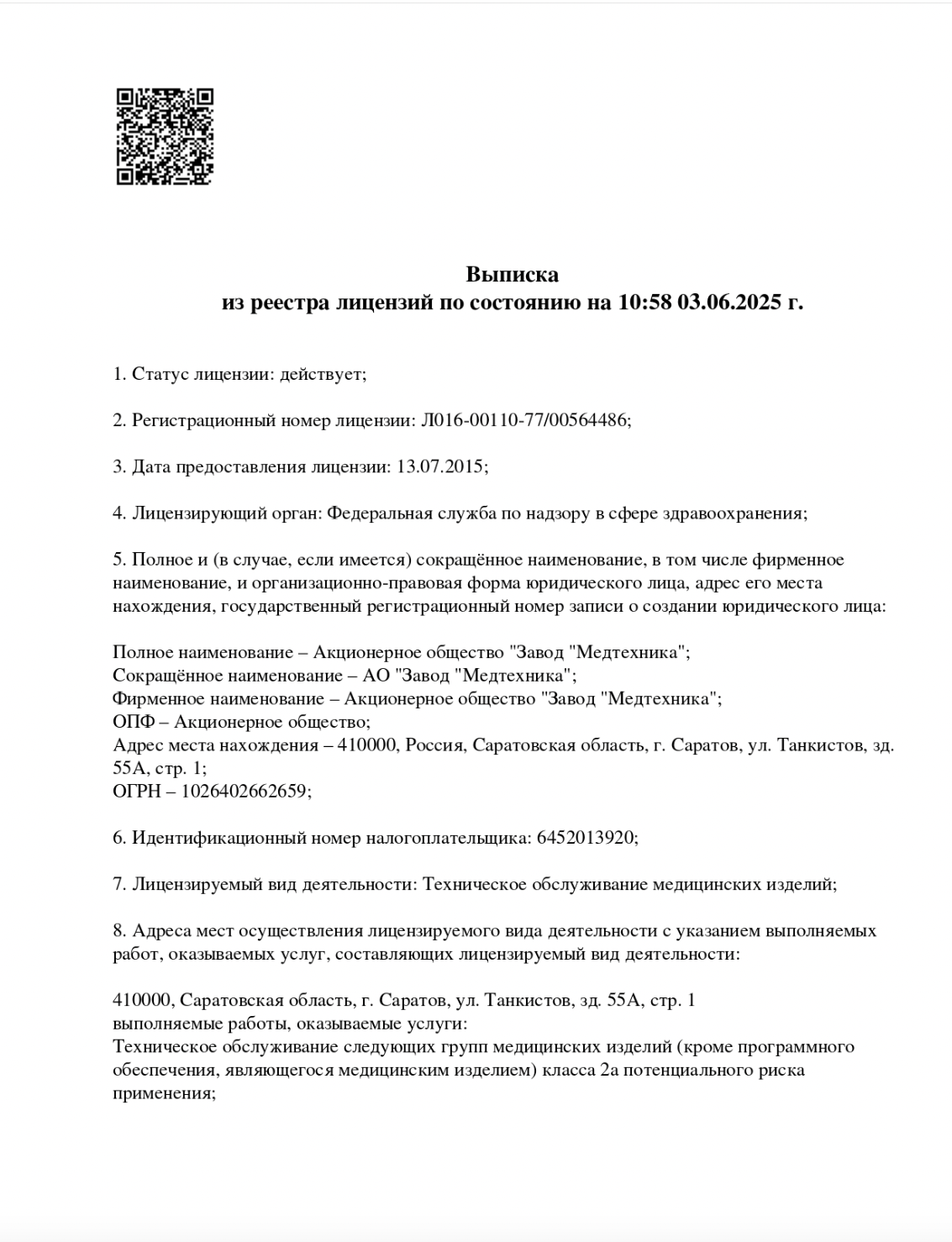 Лицензия Федеральной службы по надзору в сфере здравоохранения на осуществление деятельности по техническому обслуживанию медицинских изделий