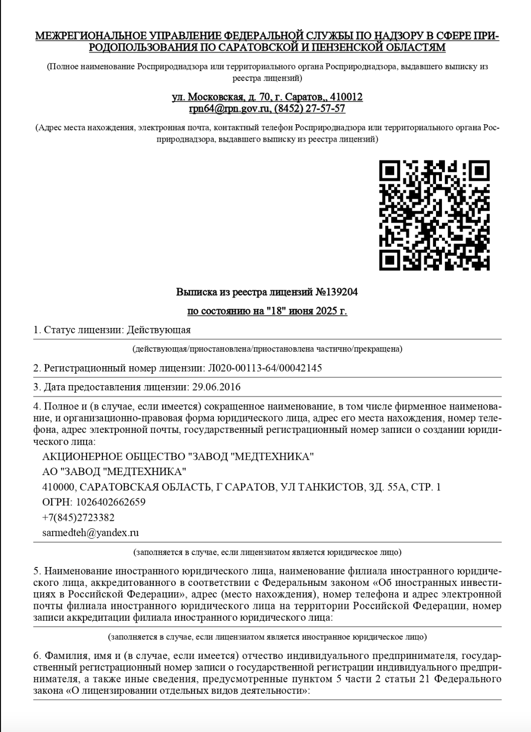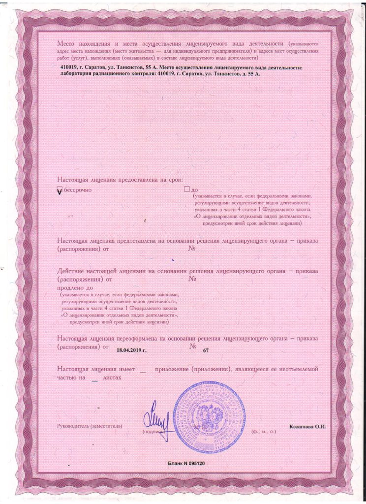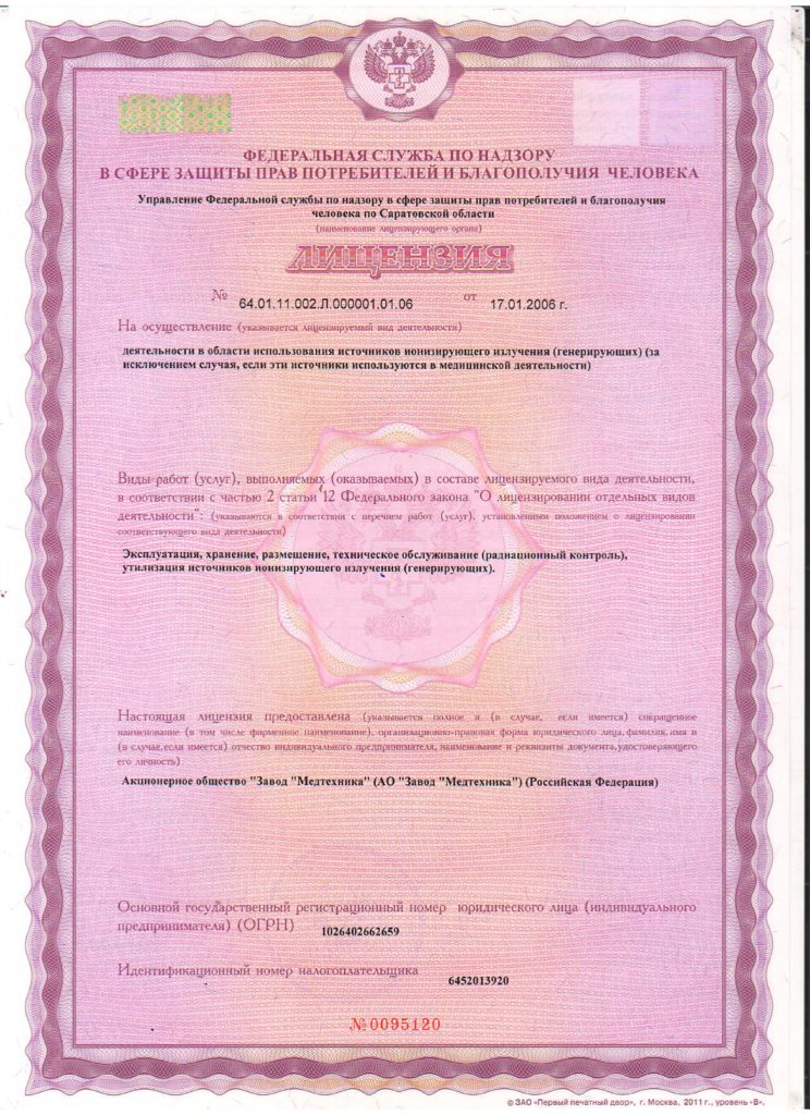 Лицензия Федеральной службы по надзору в сфере защиты прав потребителей и благополучия человека № 64.01.11.002.Л.000001.01.06 от 17.01.2006 на осуществление деятельности в области использования источников ионизирующего излучения (генерирующих)