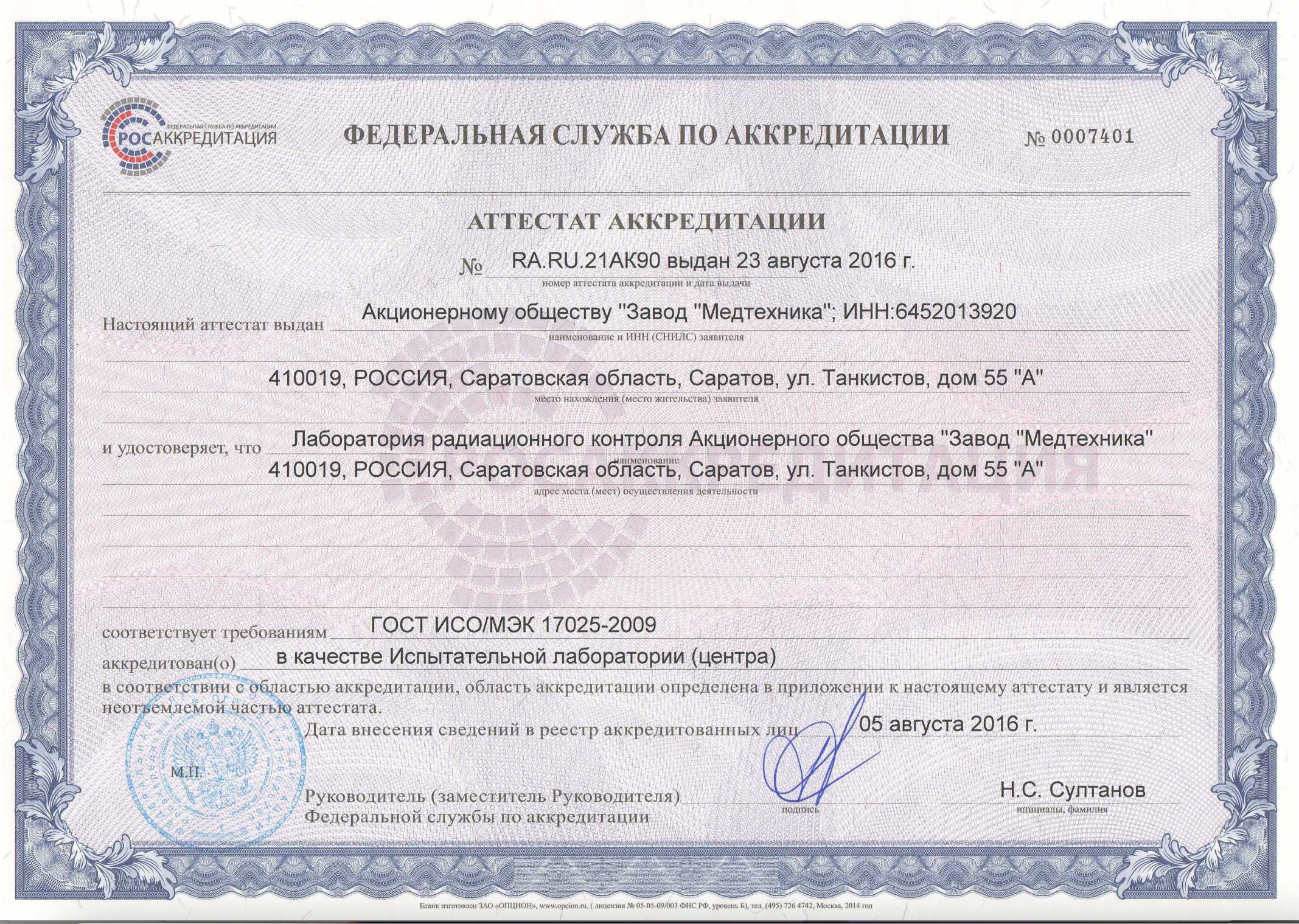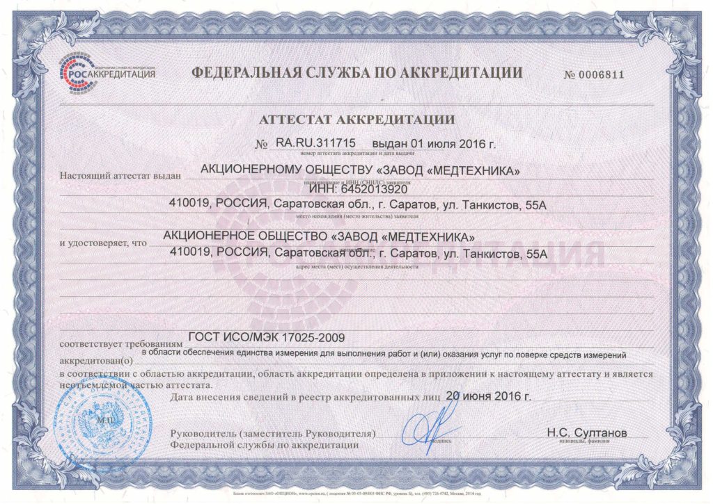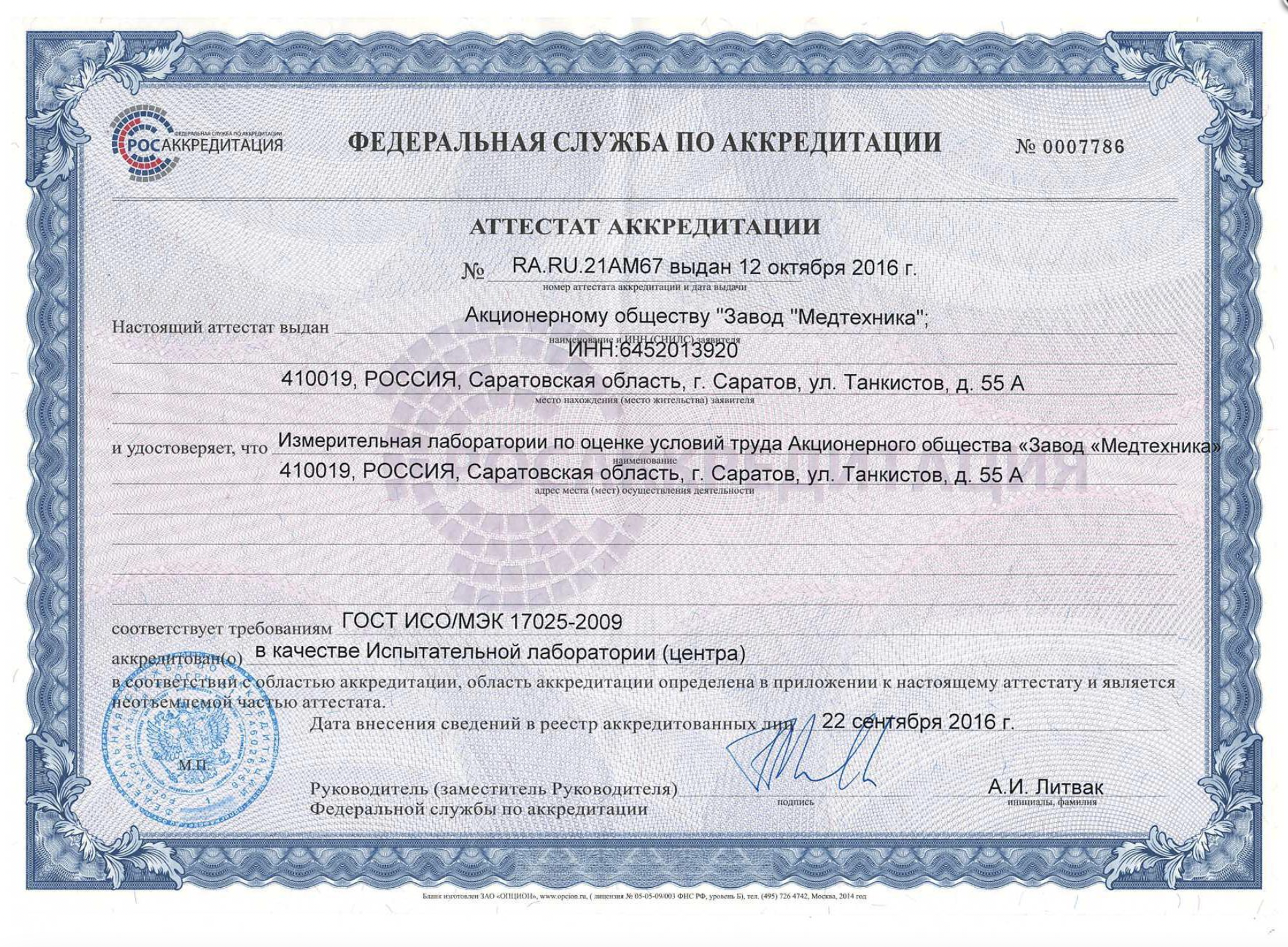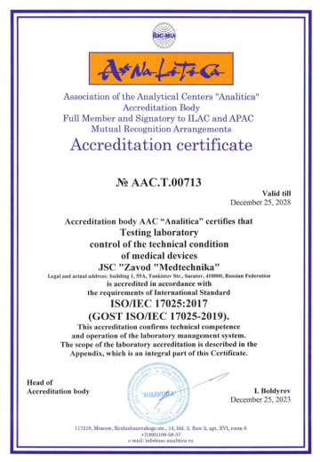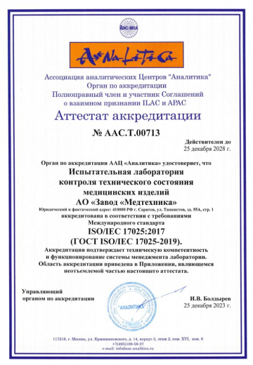 Международный аттестат аккредитации испытательной лаборатории контроля технического состояния медицинских изделий международного стандарта ISO/IEC 17025:2017 (ГОСТ ISO/IEC 17025-2019)