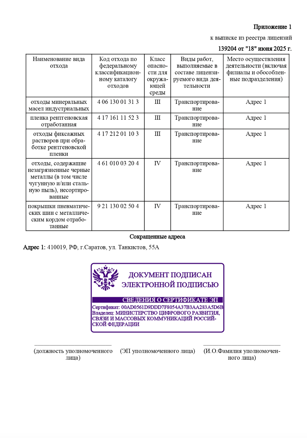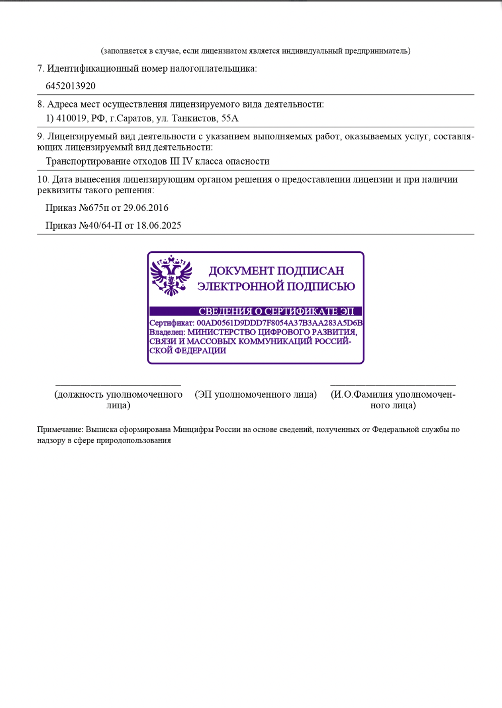 Лицензия Федеральной службы по надзору в сфере природопользования (Росприроднадзора)по Саратовской области н осуществление деятельности по сбору, транспортированию, обработке, утилизации, обезвреживанию, размещению отходов I-IV класса опасности