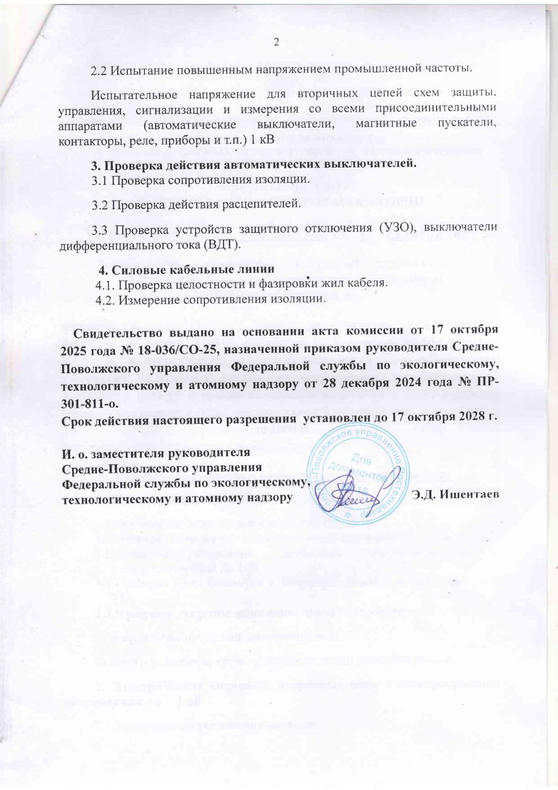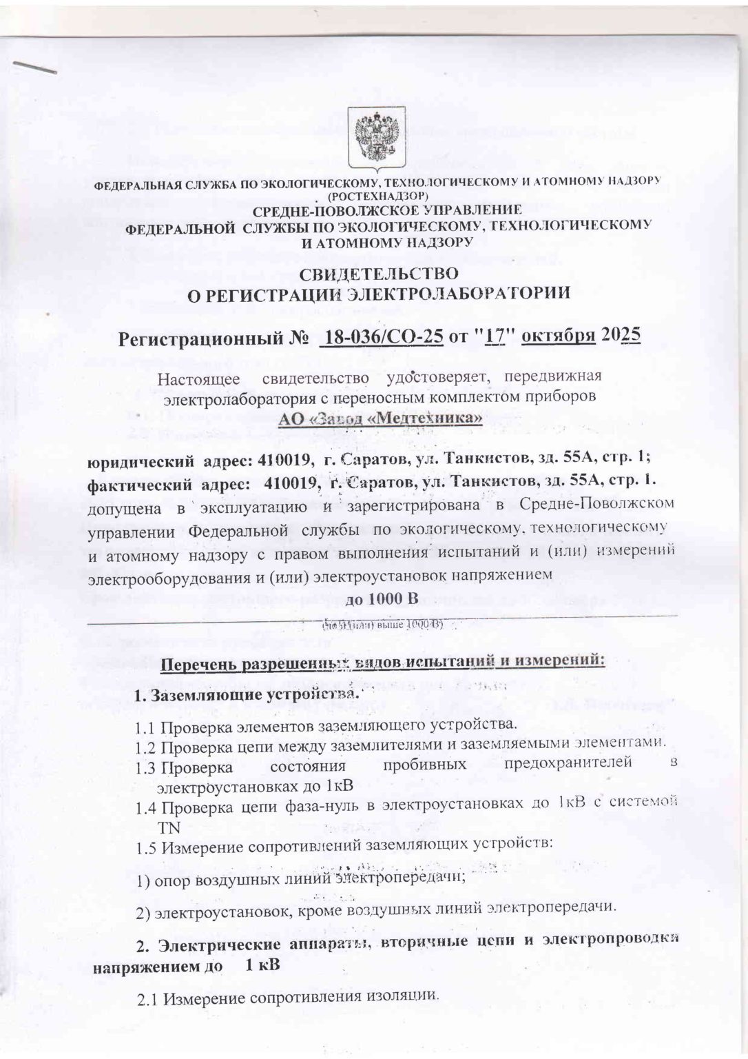 Свидетельство Средне-Поволжского управления Федеральной службы по экологическому, технологическому и атомному надзору о регистрации электролаборатории