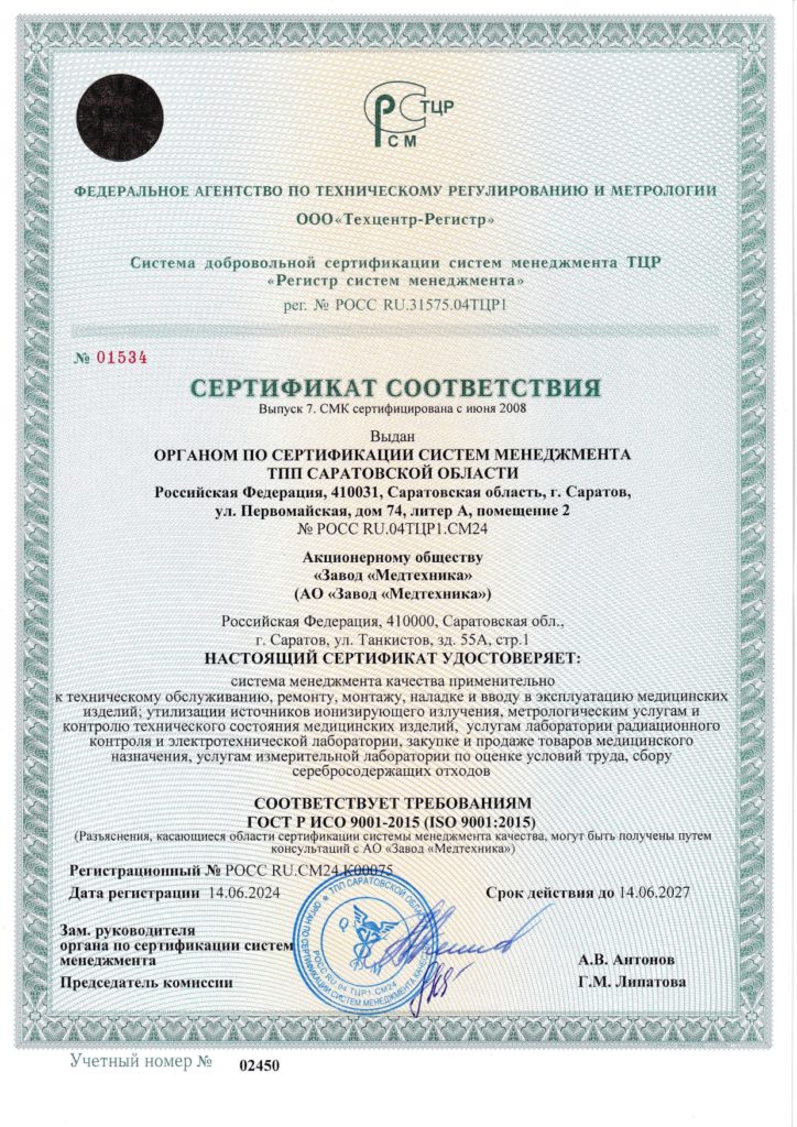Сертификат соответствия системы менеджмента качества требованиям ГОСТ Р ИСО 9001-2015 (ISO 9001:2015)